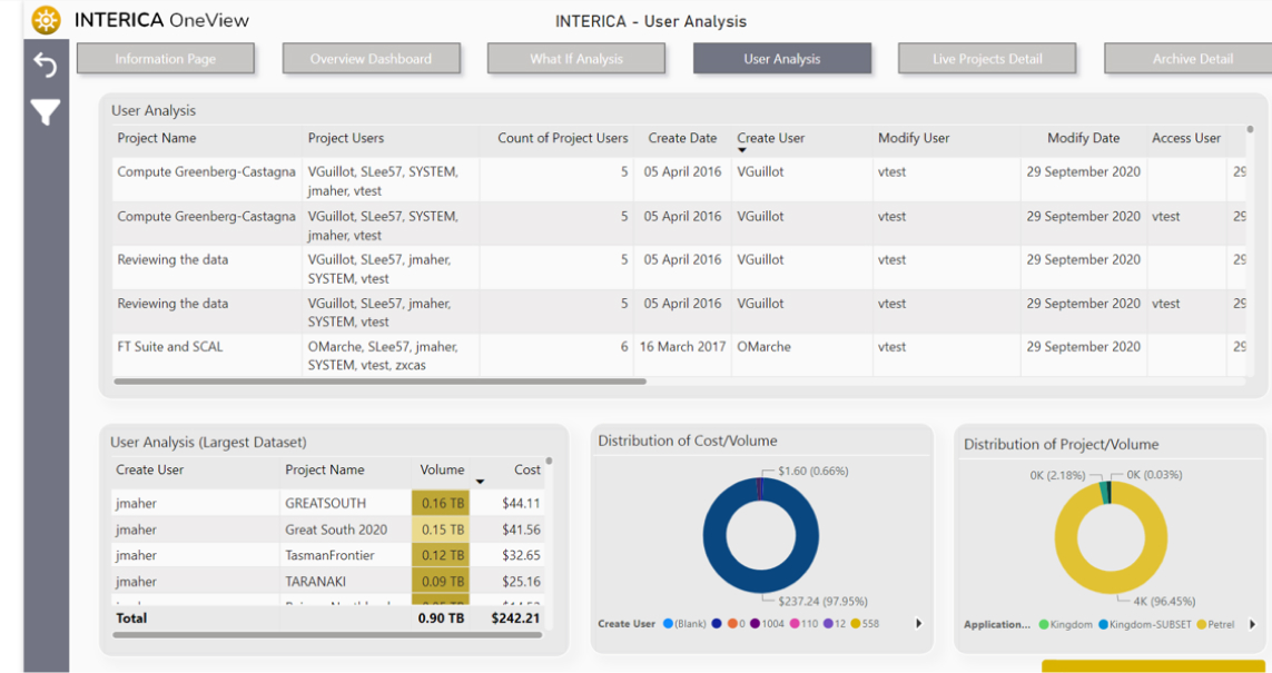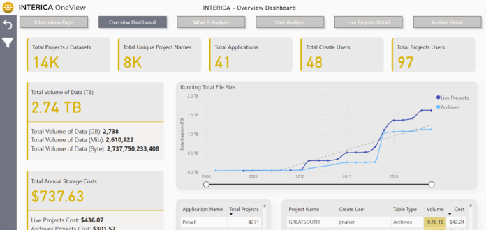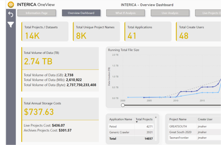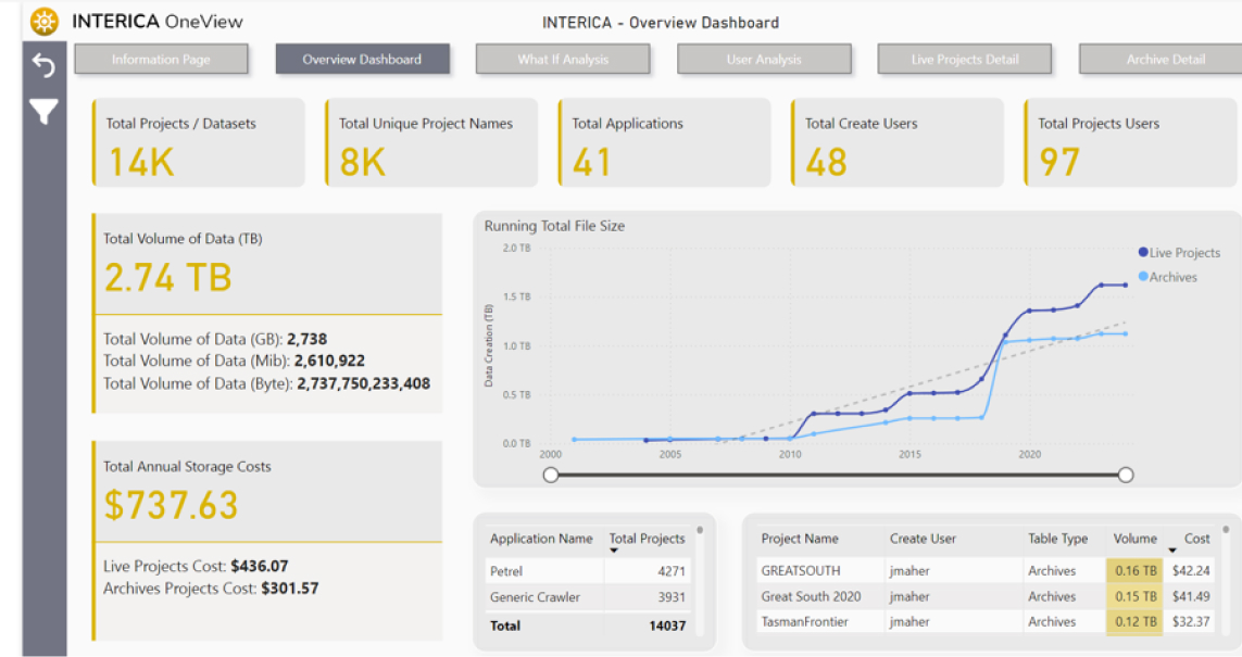 • Interactive dashboards. View charts, tables, and reports that summarise data volumes by type, location, or project, helping you prioritise archiving and processing tasks.